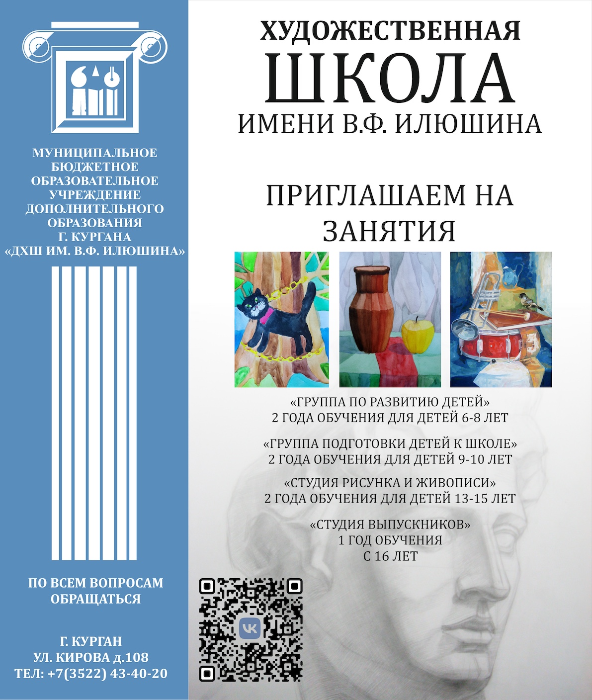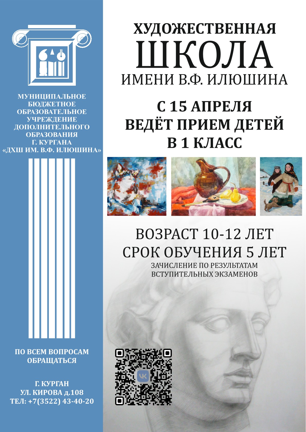 МБОУДО города Кургана «Детская художественная школа им. В.Ф. Илюшина» объявляет набор учащихся в 1 класс на 2026 – 2027 учебный год по дополнительной предпрофессиональной программе в области изобразительного искусства «Живопись» на срок обучения 5 лет. Прием поступающих детей осуществляется по…